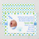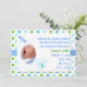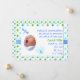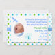 La faire-part de naissance adorable du bébé fait en pois bleu, vert et turquoise, contre un arrière - plan blanc. Une zone de texte blanche, au-dessus de l'arrière - plan de pois, a un petit cadre photo ovale découpé, sur le côté gauche, avec des graphiques mignons d'une libellule bleue et un papillon coloré autour du cadre. Le texte en bleu et vert est prêt à être personnalisé avec les informations de votre bébé. Bonne façon d'annoncer l'arrivée de votre petit Prince.