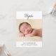 Ce faire-part de naissance photo minimaliste est doté d'une grande photo, d'une typographie de script simple et d'une palette de couleurs noir et blanc sobre. Le devant de la faire-part de naissance comprend le prénom du nouveau-né en écriture manuscrite. Une grande photo est placée sous le nom. Au bas de la faire-part de naissance, ajoutez le nom complet du bébé, la date de naissance, les statistiques de naissance et vos noms. L'arrière - plan gris neutre au dos de la carte peut être modifié. Vous pouvez ajouter des photos supplémentaires au verso de la carte.