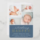 Les annonces de naissance élégantes comportent quatre photos de nouveau-nés disposées dans une grille de montage sur un arrière - plan bleu poussiéreux. "Introduce [name]" apparaît sous le script de calligraphie chic et le lettrage de bloc de feuille. Personnalisez avec le nom complet du bébé, les statistiques de naissance et une signature de famille en bas. Un design simple et propre et neutre pour annoncer l'arrivée de votre petit.