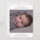 Ce faire-part de naissance photo ultra simple, moderne, minimaliste et très tendance est à la fois classique et tendance. Tout le monde aimera avoir une nouvelle photo et partager votre joie et votre excitation. La police est claire et nette en violet. C'est si facile de fabriquer les vôtres. Sélectionnez Personnalisez ce modèle, téléchargez votre photo, entrez vos informations et en quelques secondes vous pouvez voir vos annonces de naissance uniques et extraordinaires.