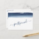 Carte de notification de report de mariage moderne et créative avec un design simple avec un coup de pinceau aquarelle bleu marine en haut accompagné du mot "reporté" dans une police manuscrite avec fioritures. Le verso contient votre message personnel et votre adresse de retour pour un envoi facile. Ce design unique est idéal pour un couple artistique.