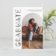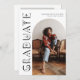 Carte de faire-part de remise de diplômes design et moderne à envoyer à la famille et aux amis. Il y a une arche blanche autour de votre photo. Vous pouvez ajouter une deuxième image au verso et le message est modifiable. Il dit "diplômé" sur le côté de la carte en police de typographie céleste et boho.