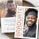 Carte de faire-part de graduation moderne avec votre photo et le texte "diplômé" dans une police moderne alignée verticalement à gauche. Photo supplémentaire et message de remerciement personnalisé au dos. Texte bleu foncé sur arrière - plan blanc.