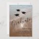 Envoyez cette carte de faire-part moderne à votre famille et à vos amis. Ce design présente une scène de plage avec des surfeurs au loin et des casquettes de grade dans l'air. Personnalisez avec votre nom, votre école et votre année.