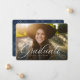 Un script classique et élégant, diplômé en blanc, se trouve au bas d'une photo horizontale. Le texte personnalisé comprend la place pour le nom du diplômé ainsi que les détails de l'école et de l'année. Le fond bleu marine classique a un simple motif de grille, et la couleur peut être changée en cliquant sur "customiser plus loin". Annoncez la réalisation de votre diplômé à vos amis et à votre famille avec ce design!
