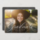 Un script classique et élégant, diplômé en blanc, se trouve au bas d'une photo horizontale. Le texte personnalisé comprend la place pour le nom du diplômé ainsi que les détails de l'école et de l'année. Le dossier gris charbon foncé a un simple motif de grille, et la couleur peut être changée en cliquant sur "customiser plus loin". Annoncez la réalisation de votre diplômé à vos amis et à votre famille avec ce design!