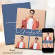 Ajoutez vos 3 photos préférées sur le devant de ces annonces de graduation qui présentent classe de et DIPLÔMÉ en lettres chic sur un arrière - plan bleu avec vos détails sur le dos. PLUS DE DESIGNS dans notre magasin.