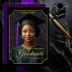 Celebrate a milestone moment with this elegant "Class of 2026" portrait-style graduation announcement. Featuring a dramatic black background, refined gold accents, and an ornate frame design, this vertical layout showcases the graduate’s photo in a timeless, formal presentation. Personalized with the graduate’s name, school, and class year, this design creates a polished keepsake perfect for honoring high school or college achievements. Ideal for sharing with friends and family, this sophisticated graduation announcement highlights pride, accomplishment, and the beginning of a new chapter. Back Background is dark purple.