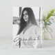 Faire-part moderne de graduation avec la photo verticale du diplômé avec "Graduate" dans une superposition de script noir élégant. Personnalisez le devant du faire-part de remise de diplômes en y ajoutant le nom du diplômé, le nom de l'école et l'année de remise de diplômes. Le dos de la faire-part de graduation branchée est orné d'un motif noir et blanc dessiné à la main.
