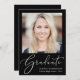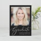 Célébrez votre diplômé avec ce faire-part de diplôme noir avec "Graduate" dans un élégant script blanc et sa photo et son nom, l'école et l'année de classe en simple typographie blanche moderne.