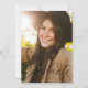 Un script classique et élégant, diplômé en noir, se trouve au bas d'une photo verticale. Le texte personnalisé comprend la place pour le nom du diplômé ainsi que les détails de l'école et de l'année. Le dossier noir correspondant a un simple motif de grille, et la couleur peut être changée en cliquant sur "customiser plus loin". Annoncez la réalisation de votre diplômé à vos amis et à votre famille avec ce design!