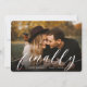 Annoncez votre fiançailles avec ces magnifiques cartes à fond saigné minimaliste avec une photo horizontale ou orientée paysage avec "enfin" superposé en lettres manuscrites blanches. Personnalisez avec vos faire-part, noms et détails supplémentaires.