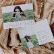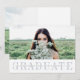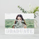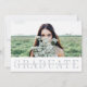 Cette annonce de photo de remise de diplôme moderne et minimaliste présente votre photo préférée au format paysage ou horizontale sur le devant, avec « graduate » affiché en dessous dans une élégante lettre grise-bleu. Personnalisez avec votre nom, école et année de remise de diplôme sur une superposition de bande blanche transparente. Les cartes se retournent sur une photo supplémentaire accompagnée des détails de votre fête de remise de diplôme. Une annonce de remise de diplôme et une invitation à la fête simples et élégantes par Redwood & Vine Design Co.