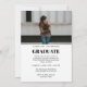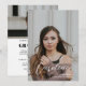 Une invitation et carte d'annonce de diplômé moderne et élégante avec un script stylé, superposition de texte et deux (2) photos (photo de portrait complet à l'avant et photo de paysage de demi-carte à l'arrière). Les photos et les détails sont faciles à personnaliser.