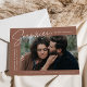 Partagez les nouvelles de votre fiançailles surprise avec ces annonces élégantes de fiançailles photo. Le design comporte l'expression "Surprise, nous nous sommes engagés !" dans un script blanc tendance et des lettres modernes sur un arrière - plan marron couleur argile. Votre photo fiançailles est présentée dans la partie centre-droit du design avec vos noms et la date fiançailles affichés à gauche. Personnalisez le faire-part fiançailles surprise en ajoutant des détails supplémentaires ci-dessous tels que la ville/l'état mariage, le site Web mariage, etc. La faire-part s'inverse pour afficher un motif de feuillage couleur argile brune sur un arrière - plan blanc.