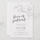 Élégante et moderne carte d'annonce de report de mariage avec une illustration dessinée à la main de fleurs de magnolia de couleur ivoire et gris avec un texte en écriture cursive en dessous qui dit "l'amour est patient."