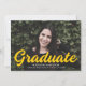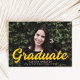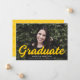 Faire-part de graduation simple et élégante avec la photo horizontale du diplômé avec "Graduate" dans un script jaune gras. Personnalisez le faire-part de remise de diplômes photo en ajoutant le nom du diplômé, le nom de l'école et l'année de remise de diplômes. La faire-part s'inverse pour afficher un motif d'arc géométrique jaune et blanc.