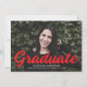 Faire-part de graduation simple et élégante avec la photo horizontale du diplômé avec "Graduate" dans une écriture rouge audacieuse. Personnalisez le faire-part de remise de diplômes photo en ajoutant le nom du diplômé, le nom de l'école et l'année de remise de diplômes. La faire-part s'inverse pour afficher un motif d'arc géométrique vert et blanc.