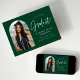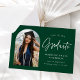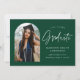 Faire-part tendance de remise des diplômes avec la photo du diplômé encadrée par une arche verte avec "Graduate" dans une écriture manuscrite blanche. Personnalisez l'avant de la carte de faire-part de remise de diplômes en arc en ajoutant le nom du diplômé, l'année de remise de diplômes, le nom de l'école et les plans futurs. La faire-part de graduation de la photo s'inverse pour afficher un motif pointillé vert et blanc. Le faire-part convient aussi bien aux diplômés du secondaire qu'aux diplômés du collégial.