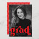 Annonces de fin d'études élégantes avec la photo verticale du diplômé avec "grad" en caractères rouges gras. Personnalisez le faire-part de remise de diplômes en photo en ajoutant le nom du diplômé, l'année de remise de diplômes et l'école. La faire-part s'inverse pour afficher un motif d'arc rétro rouge et blanc.