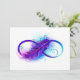Infinity symbole with a beautiful feather painted in purple and blue bright colors on white background