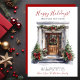 Cette aquarelle Happy Holidays nouvelle maison pour les vacances carte de faire-part avec une porte d'entrée en bois décorée de façon festive avec une pinède, des arbres, une couronne et des arcs de vacances rouges serait parfait pour envoyer à vos amis et votre famille maintenant que vous avez déménagé dans une nouvelle maison. Le sentiment est personnalisable. Obtenez assez pour que tous ceux que vous connaissez et aimez aient votre nouvelle adresse. Ils seront tellement excités par votre grand mouvement !