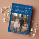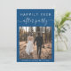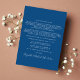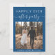 Elément moderne bleu classique ou faire-part mariage plus petit et invitation à la réception d'informer la famille et les amis que vous avez été marié dans une petite cérémonie de mariage intime, et de les invitation maintenant à une réception de mariage. Le devant présente votre photo de jour de mariage et "Happily Ever After Party" dans un mélange de typographie blanche simple et de script blanc tendance avec des swashes. Sous votre photo, vous pouvez ajouter vos prénoms et votre date de mariage. À l'envers, vous pouvez personnaliser votre message de manière plus détaillée et ajouter les détails de l'invitation de réception ou de la partie et vos noms dans un script de type signature.