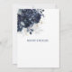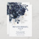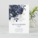 Un bouquet floral bleu marine moderne et élégant avec son ombre doucement débordant sur l'invitation et éclaboussant d'or éclaboussant et des éléments, avec vos prénoms dans une police moderne avec une date mariage numérique en dessous et une petite police pour les détails.