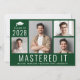 Faire-part de diplôme de maîtrise moderne vert avec un collage photo de 4 images, "Mastered It" en grandes lettres blanches et l'année de classe de la grade, nom et l'école ou l'université en simple typographie blanche. Au verso, ajoutez une photo supplémentaire et un message personnalisé.