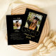 Design moderne élégant en noir et or. Ajoutez votre photo spéciale ! Le nom et l'année du diplômé sont ci-dessous. Le texte et les spécifications d'or en haut et en bas de la carte sont en feuille d'or. L'arrière dispose d'une autre photo et d'un message personnalisé à partager avec votre famille et vos amis. L'année est personnalisable et peut être changée. Il y a un choix de feuilles de couleurs différentes.