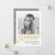 Annoncez votre diplôme avec une faire-part chic et moderne de graduation. Le design comprend une police de script tendance dans un style de feuille d'or faux, des espaces réservés pour une image et un texte personnalisé, et un motif art déco noir et blanc à l'arrière.