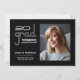 Style high tech moderne 2 Cartes de faire-part de remise de diplômes photo, avec des éléments de conception de texte sophistiqué lisant "Grad" et l'année de remise de diplômes, ainsi qu'un espace pour votre école et ville, et bien sûr votre nom. Une photo à l'avant de la carte avec une deuxième photo à l'arrière. Le dos de la carte offre également des espaces de texte personnalisés pour des informations sur votre graduation et votre futur voyage. Les couleurs sont le blanc et le gris argenté du texte sur le noir ou changer facilement la couleur arrière - plan comme vous le souhaitez. Idéal pour les personnes âgées du secondaire, du collège et de l'université.