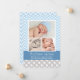 Carte d'annonce de naissance photo audacieuse et ludique avec trois photos de votre bébé garçon encadrées par un motif chevron bleu ciel et blanc élégant. Le nom du bébé apparaît en écriture calligraphique sur une bannière bleu sarcelle avec les informations de naissance et un message "Parents fiers" en blanc. Le dos est habillé d'un motif à pois gris et blanc coordonné. Toutes les couleurs et le texte sont entièrement personnalisables.