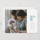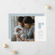Une introduction simple pour votre nouveau petit avec une photo unique, une grande initiale bleue, une salle pour les statistiques et les noms des parents ainsi qu'un support de coordination pointillé. Vous voulez une couleur différente ? Cliquez sur "personnaliser" pour ajuster.