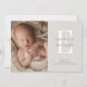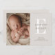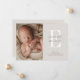 Le Faire-part de naissance photo moderne Neutre initial pour bébé trois montre votre photo verticale sur le devant, ainsi que l'initiale du bébé. Deux autres photos sont à l'arrière.
