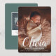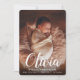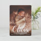 Laissez le nom du bébé prendre le centre de la scène avec ces annonces de naissance élégantes, avec une photo verticale avec le prénom du bébé, surmonté d'un script de calligraphie blanche en lettres. Personnalisez avec le milieu et le nom de famille et les statistiques de naissance du bébé en dessous, et ajoutez une photo supplémentaire à l'arrière, ainsi qu'un message personnel.