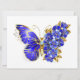 Bijoux, bleu, saphir, papillon aux fleurs pétillantes avec aile décorée de bleu, fleurs précieuses avec feuilles d'or sur arrière - plan blanc.