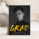 Annoncez votre graduation avec nos annonces de graduation photo Modern Paint Splatter. Le design présente la photo verticale du diplômé avec "Grad" en lettres jaunes avec des éclaboussures de peinture blanche. Personnalisez le devant des annonces de graduation créatives en ajoutant le nom du diplômé, le nom de l'école et l'année de fin d'études. L'arrière de la faire-part est orné d'un arrière - plan jaune avec des éclaboussures de peinture blanche. Le design est parfait pour les diplômés du secondaire et du collège.