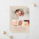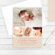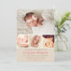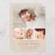 Cette carte de faire-part de naissance photo élégante et douce comprend quatre (4) photos de votre nouveau-né, du texte personnalisé qui peut être personnalisé, des accents cardiaques et un jeu de couleurs rose rose et marron clair avec un arrière - plan beige neutre rustique.