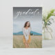 Un script classique simple "gradué" en blanc accentue une seule photo verticale de votre grade. Ce faire-part d'obtention de diplômes fonctionne pour les diplômés du collège ou du secondaire et est assez simple pour laisser briller votre photo. C'est un design intemporel et dispose également d'un dossier rayé avec une couleur personnalisable (par défaut, c'est un gris fusain classique). Les mots sont en haut de la photo mais le design est aussi disponible avec les mots en bas.