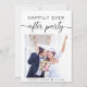 Faire-part de mariage ou annonce de mariage discret moderne et invitation à la réception. Le recto présente votre photo, "Happily Ever After Party" dans une typographie simple et un script tendance avec des fioritures et vos noms et date de mariage. Au verso, personnalisez votre annonce et invitation, entrez l'adresse de votre site web de mariage pour créer un code QR que les invités pourront scanner pour voir vos photos de mariage, tous les détails et répondre en ligne, et ajoutez vos noms dans un script ressemblant à une signature.