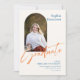 Ce faire-part de graduation plat de 5" x 7" est doté d'une photo en arc sur le devant d'un arrière - plan en ivoire avec lettrage noir. Les titulaires de permis comprennent, le nom du diplômé, le nom du collège ou de l'université, le diplôme, le domaine d'intérêt du diplôme et une ligne supplémentaire pour obtenir de l'information supplémentaire comme des distinctions honorifiques spéciales.