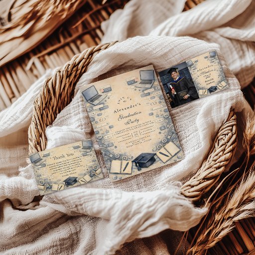 Celebrate a major academic milestone with this refined software engineering graduation design, inspired by modern technology and classic academic tradition. Featuring coding icons, laptops, technical symbols, and a parchment-style background, the artwork reflects problem-solving, innovation, and years of focused study in computer science and software development.