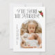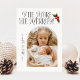 Elégante carte de faire-part de naissance de Noël avec texte typographique mélangé de polices de script et de serif qui dit "plus le plus merrier" avec une aquarelle illustration de baies rouges. Le cadre de la photo est en forme d'arc. C'est une carte faire-part de naissance pour les saisons de vacances ! Ajoutez vos photos, vos statistiques de naissance et un message ! La photo verticale fonctionne le mieux à l'avant.