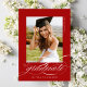 Red Modern Elegant Script Black White Graduation Faire-part dispose d'un script magnifique et élégant, avec les détails de votre fête, et votre photo complète au dos.