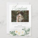 Belles roses blanches et bouquets floraux eucalyptus quatre photo collage "Graduate" recto-verso Faire-part de graduation. Ajoutez simplement les photos et les détails de votre grad pour compléter cette conception. Conception composite par Holiday Hearts Designs (droits réservés).