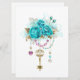 Clé d'or antique aux roses turquoise tendance décorée de feuilles d'or blanc et de perles rose et bleu. Couleur tendance. Rose turquoise. Blanc doré. Tiffany bleu.