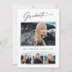 Quatre cartes photo, tendance, modernes et élégantes, avec des éléments design de texte moderne avec script d'encre de calligraphie. Les photos des diplômés sur le devant de la carte sont mises en évidence avec une délicate et minimaliste planche à dégradé. Le dos de la carte offre des espaces de texte personnalisés pour des informations sur votre diplôme ou peut être effacé si vous souhaitez écrire un message à la main. Noir et blanc ou customiser facilement l'arrière - plan pour correspondre à la couleur primaire de votre école ou à n'importe quelle couleur de votre choix. Parfait pour les étudiants de niveau secondaire, collégial et universitaire.