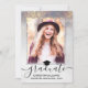 Envoyez à votre famille et à vos amis cette carte de faire-part de graduation photo personnalisée moderne pour les wow. Ce design présente votre photo à l'avant bordée d'étincelles et de parties scintillant d'argent et d'or. Sous la photo, on peut lire "Graduate" en typographie en script noir avec votre nom, l'école et l'année pour personnaliser. Le dos de la carte a une 2ème photo avec plus de graduation et de détails futurs à customiser. Conçu par Susan Coffey.