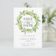 Jolie aquarelle olives vertes et la couronne feuillue, Mariage Enregistrer la carte de date. Le dos de la carte est assorti à la motif d'olivier et de verdure. Conçu pour correspondre à notre collection toscane de verdure d'olivier.